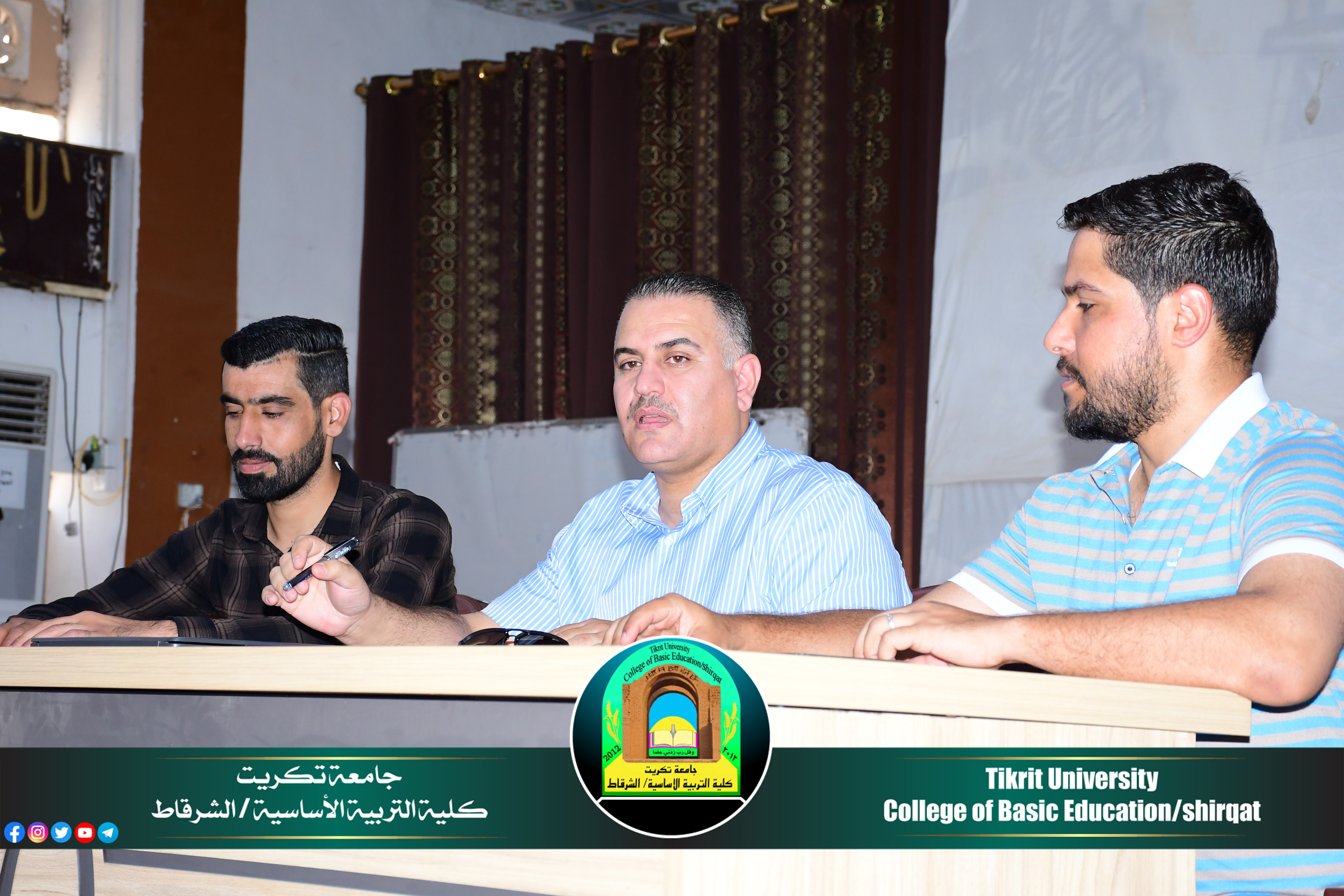 اقامت كليتنا بالتعاون مع مركز التعليم المستمر في جامعتنا ندوة علمية بعنوان (تقييم خريجي كلية التربية الاساسية/ الشرقاط /قسم الرياضيات المعينين على ملاك وزارة التربية) وذلك يوم الثلاثاء الموافق 2024/8/13 وتمت مناقشة الندوة من قبل المدرس الدكتور اياد حمد خلف رئيس قسم الرياضيات والاستاذ المساعد لؤي موسى راوي مقرر القسم والمدرس المساعد احمد طه احمد والمدرس المساعد علاء فرحان احمد
