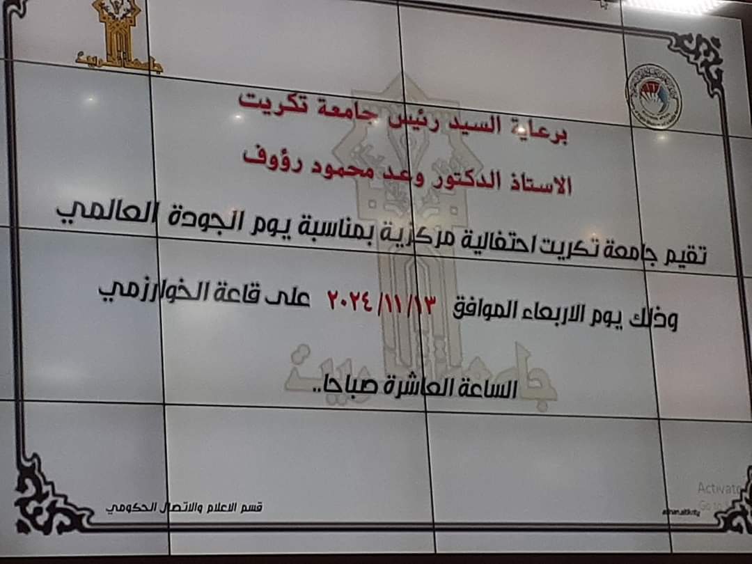 برعاية وحضور رئيس جامعة تكريت الاستاذ الدكتور وعد محمود رؤوف وايماناً منها بالدور الذي تلعبه الجودة في اجراء التحسينات في العمل المؤسسي اقامت الجامعة اليوم الاربعاء الموافق 13/11/2024 احتفالية مركزية بمناسبة يوم الجودة العالمي والذي يوافق الثاني عشر من شهر نوفبر .شاركت المدرس الدكتور سراب عبدالستار محمد مسؤول شعبة ضمان الجودة والتقييم في الكلية بالاحتفالية  وتم تكريمها بدرع جامعة تكريت تقديراً للجهود المبذولة.