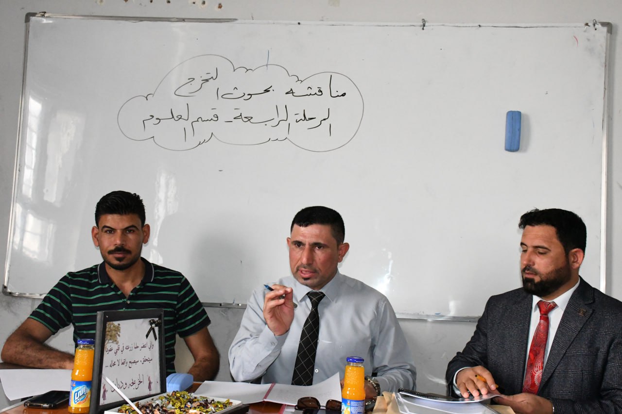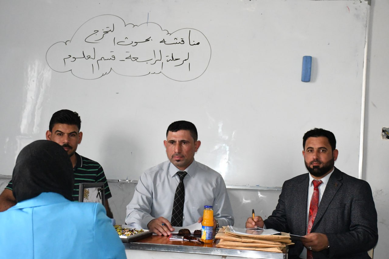 جرت هذا اليوم مناقشات بحوث الطلبة للمرحلة الرابعة لقسم العلوم في كليتنا من قبل اللجان العلمية المختصة لمناقشة كل طالب، وتمت المناقشات حسب الضوابط العلمية للبحوث المقدمة .