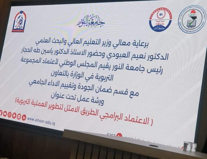 شارك كلٌ من الاستاذ المساعد الدكتور (عبدالمنعم عبدالله خلف) والمدرس الدكتور (سراب عبدالستار محمد) والمدرس المساعد (هبة احمد ابراهيم) التدريسيون على ملاك كليتنا في ورشة العمل المقامة في جامعة النور بعنوان (الاعتماد البرامجي الطريق الامثل لتطوير العملية التربوية)