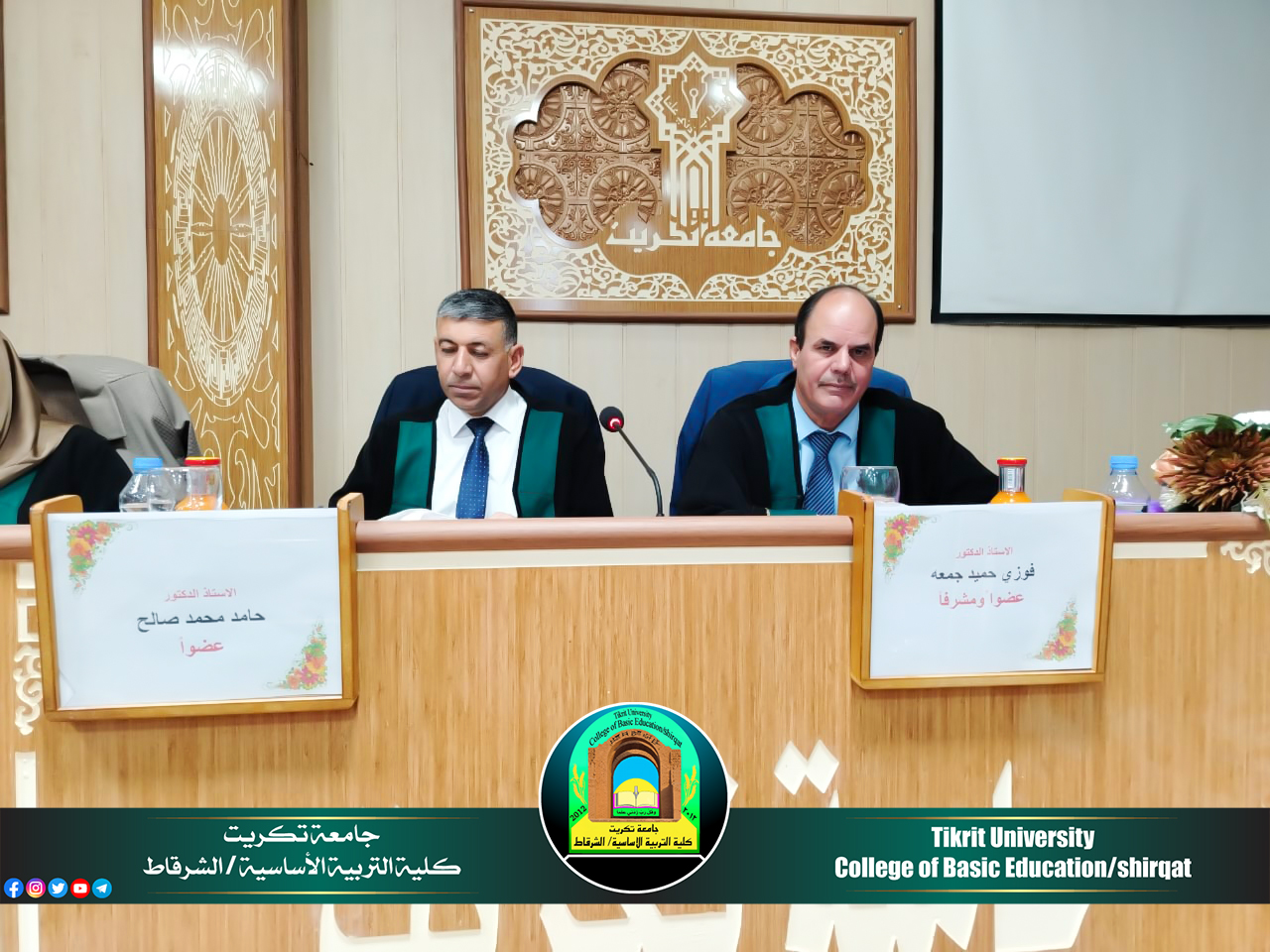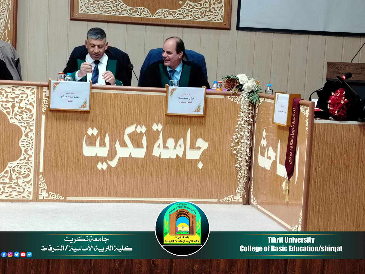 شارك الأستاذ الدكتور (حامد محمد صالح) عميد كليتنا بعضوية لجنة مناقشة أطروحة الدكتوراه في كلية التربية للبنات بجامعة تكريت للطالبة (شيماء سعود صبري) اختصاص (الكيمياء) عن اطروحتها الموسومة بـ ((تحضير وتشخيص بعض المركبات الحلقية غير المتجانسة (الخماسية- السباعية) المشتقة من تيرفثالات ثنائي الاثيل الثنائية و دراسة بعض تطبيقاتها)) يوم الخميس الموافق 2025/2/27، وقررت اللجنة قبول اطروحة الطالب ومنحها شهادة الدكتوراه في تخصصها الدقيق، متمنين لها دوام الموفقية والمزيد من العطاء والابداع العلمي المتواصل والمستمر خدمة للمسيرة التعليمية.