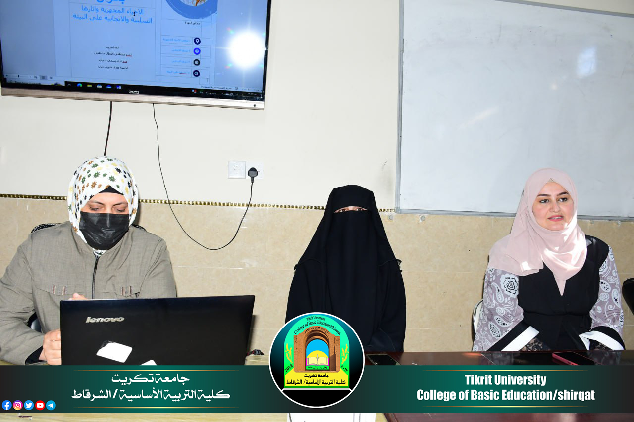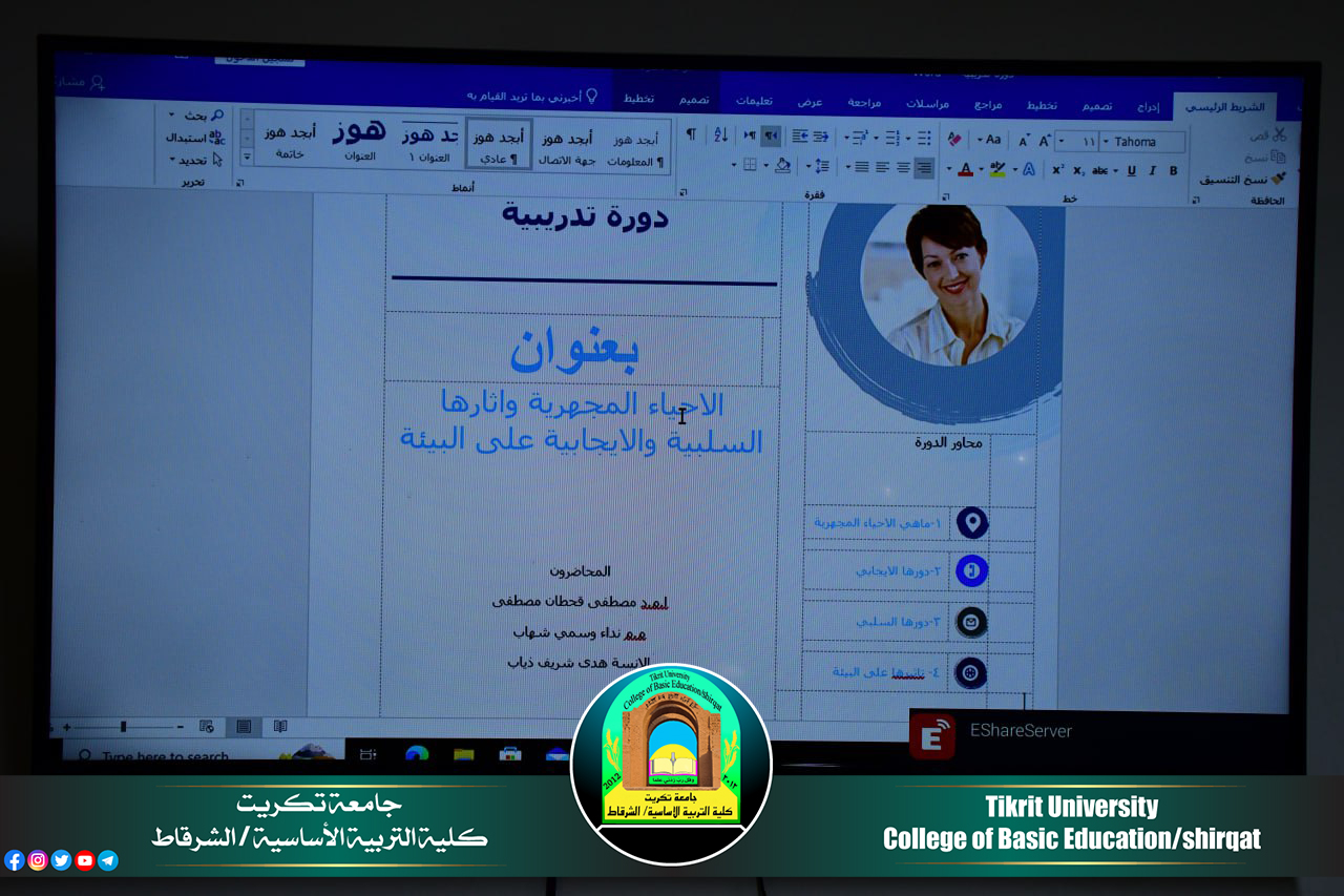 اقامت كليتنا بالتعاون مع مركز التعليم المستمر في جامعتنا دورة بعنوان (الاحياء المجهرية واثارها السلبية والايجابية على البيئة) ليومي الاربعاء والخميس الموافقين 30_31-10-2024 وقام بمناقشة الدورة كل من الاستاذ المساعد الدكتور (مصطفى قحطان مصطفى) والآنسة (هدى شريف ذياب) والمدرس المساعد (نداء وسمي شهاب) التدريسية على ملاك وزارة التربية/ المديرية العامة لتربية صلاح الدين/ قسم تربية الشرقاط.