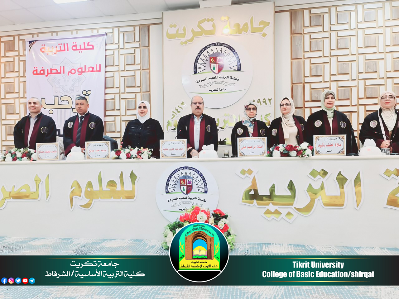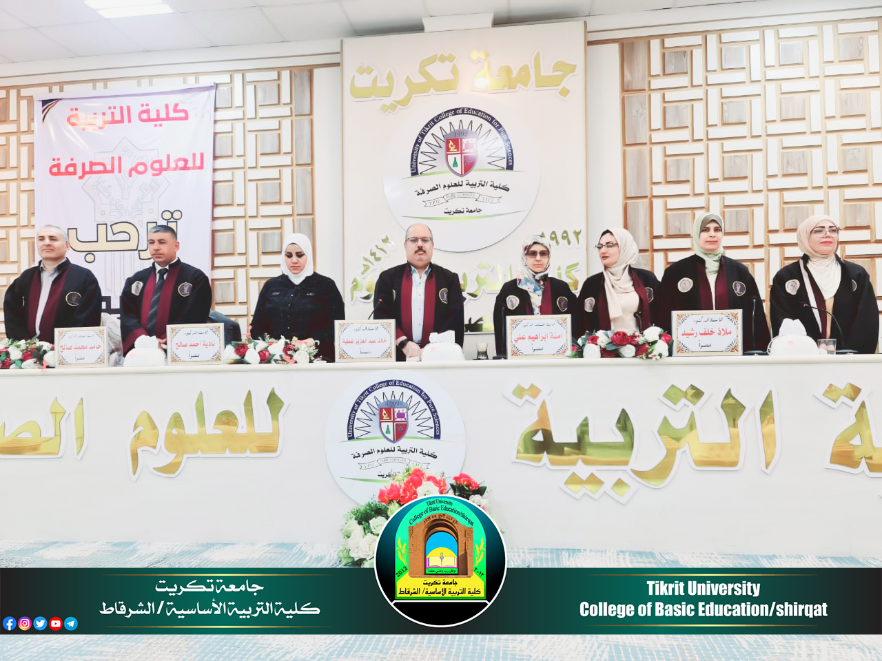شارك الأستاذ المساعد الدكتور (حامد محمد صالح) عميد كليتنا  بعضوية لجنة مناقشة اطروحة دكتوراه في كلية التربية للعلوم الصرفة/ بجامعة تكريت للطالبة (ساكار مبارك عبدالرزاق)  الموسومة ((تحضير وتشخيص بعض مشتقات الكوينولين وتناسقها مع بعض الفلزات والفوسفينات وتقييم فعاليتها البايولوجية)) يوم الخميس الموافق 1/8/2024 ، وقررت اللجنة قبول اطروحة الطالبة ومنحها شهادة الدكتوراه وفقاً للفقرة (أ)، متمنين لها دوام الموفقية والمزيد من العطاء والابداع العلمي المتواصل والمستمر خدمة للمسيرة التعليمية.