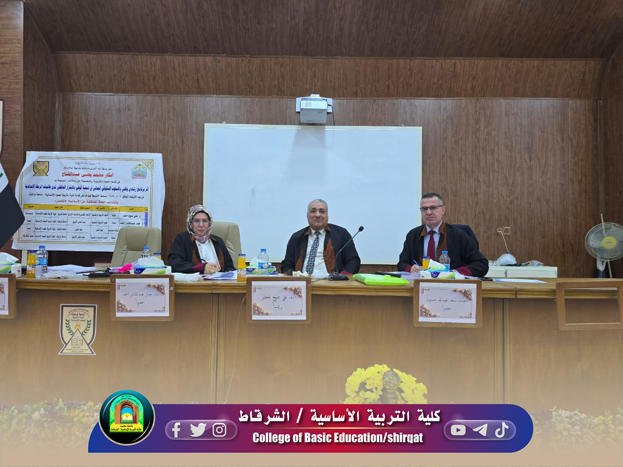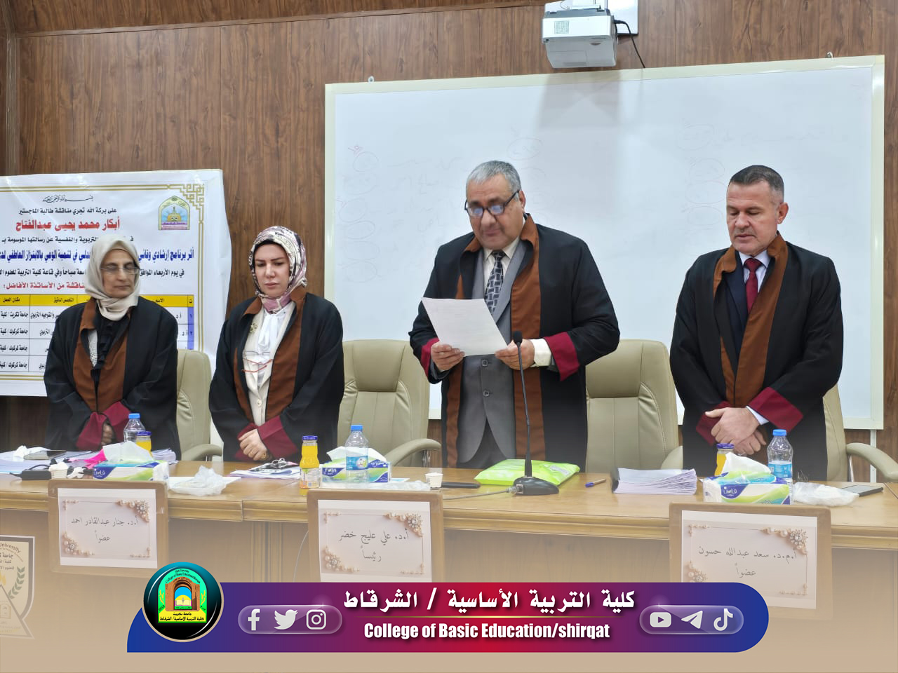 ترأس الأستاذ الدكتور على عليج خضر رئيس قسم العلوم في كليتنا لجنة مناقشة ماجستير للطالبة أبكار محمد يحيى عبد الفتاح في جامعة كركوك / كلية التربية للعوم الإنسانية / قسم العلوم التربوية والنفسية عن رسالتها الموسومة (أثر برنامج إرشادي وقائي بالأسلوب السلوكي الجدلي في تنمية الوعي بالابتزاز العاطفي لدى طالبات المرحلة الإعدادية) وذلك يوم الأربعاء الموافق 5/11/20205 وبعد مناقشة علمية مستفيضة، قررت اللجنة منح الطالبة شهادة الماجستير بتقدير (جيد جداً)، متمنين له دوام التوفيق والمزيد من العطاء العلمي المتميز في خدمة المسيرة الأكاديمية والبحث العلمي.