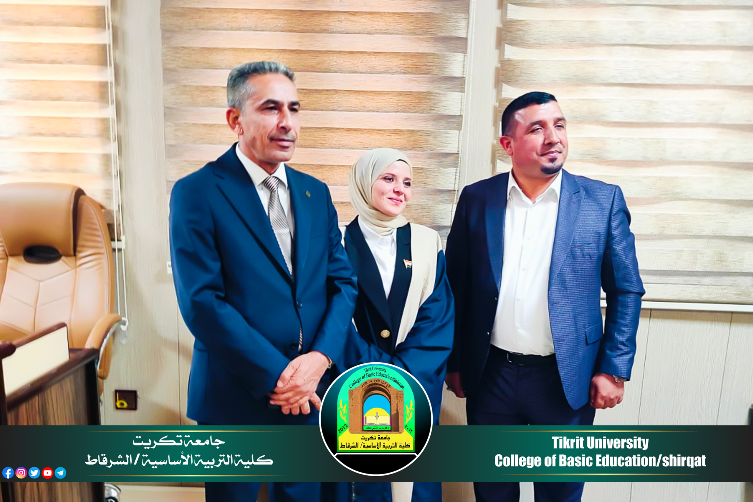 يسرُّ أسرة كلية التربية الأساسية/ الشرقاط أن تتقدم بأحر التهاني والتبريكات للسيدة هبة احمد ابو اليقضان، الموظفة على ملاك كليتنا، بمناسبة حصولها على شهادة الماجستير بعد مناقشة رسالتها الموسومة بـ ((تصميم وتصنيع مصفوفة هوائيات الشريحة الرقيقة مزدوجة الحزمة))، في كلية العلوم/ جامعة تكريت وبتقدير أمتياز.